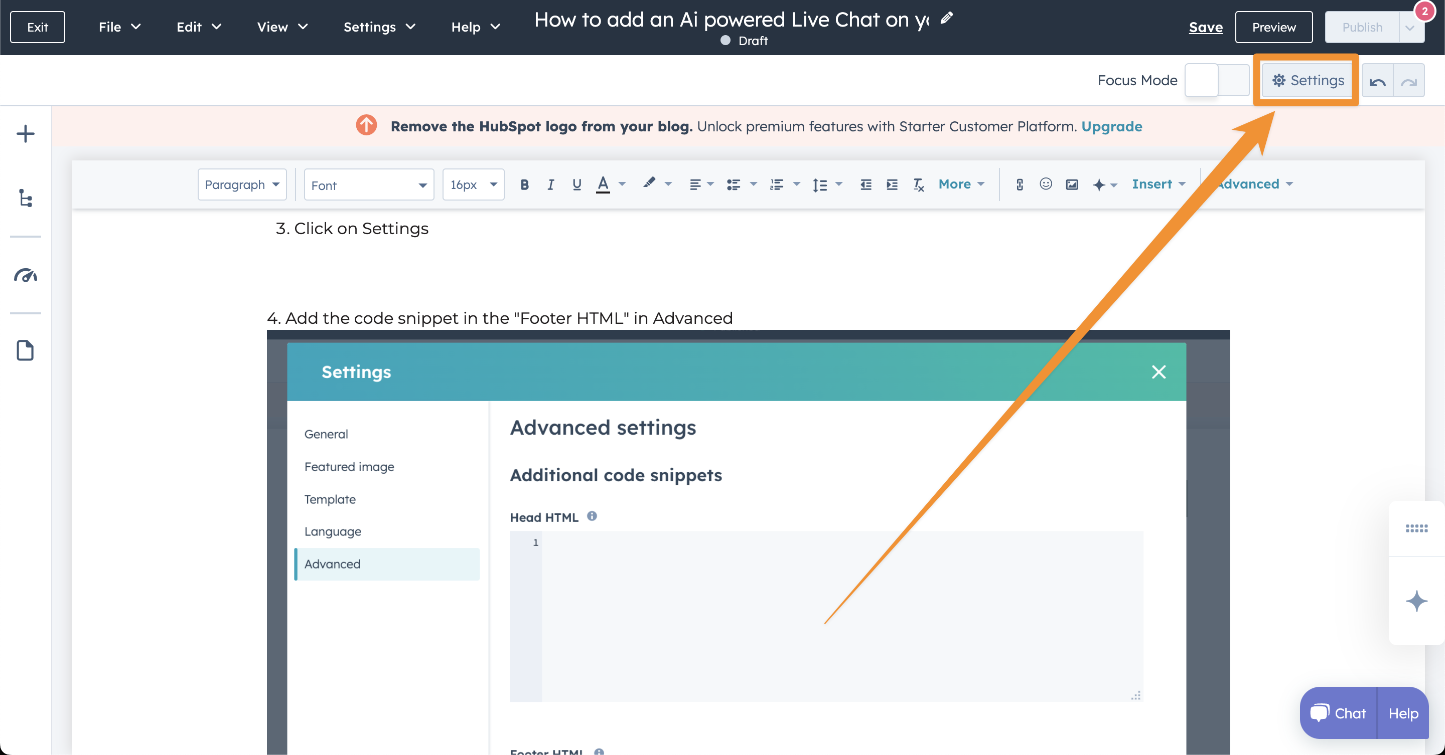 Oct 7, 2024 10:45:15 AM How to add an Ai powered Live Chat on your Hubspot website Vincenzo Belpiede Share: facebook-f icon linkedin-in icon Twitter icon pinterest-p icon envelope icon Login into Hubspot Go to "Websites Pages" Click on Settings 4. Add the code snippet in the "Footer HTML" in Advanced How to